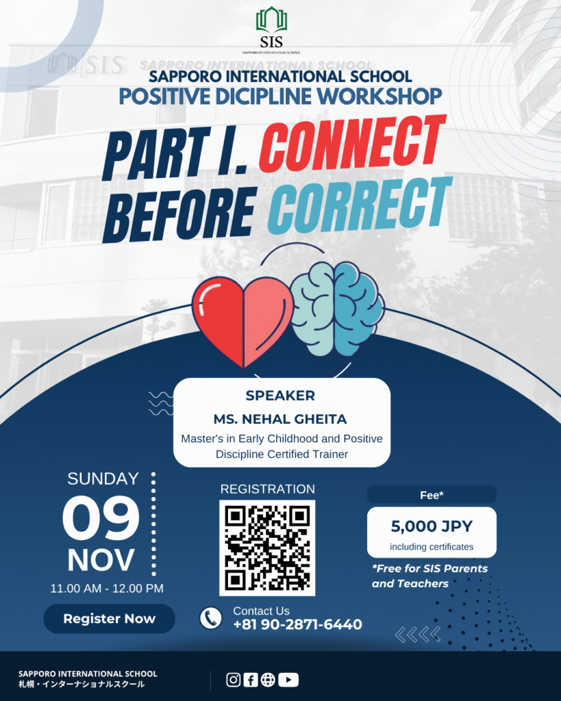 Facebook Instagram Youtube Twitter Whatsapp Home Profile About SIIS Board Committee Staff PTA Academic Calendar Academics Kindergarten Elementary School Summer School After School Admission Career Contact Us Hamburger Toggle Menu Positive Dicipline Workshop Part I. Connect before Correct Date: Sunday, November 9, 2025 Positive Discipline Workshop: “Connect Before Correct” Join us at Sapporo International School […]